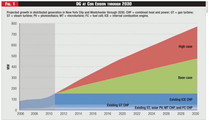 The forecast for Con Edison’s summer 2012 peak demand is 13,225 MW. And there is currently 160 MW of grid-connected DG in Con Edison’s service territory, 90 MW of which are natural-gas-fired CHP projects installed in the past three years alone. From 2012 through 2018 an additional 75 MW of large-scale customer-sited CHP is planned to be installed, based on discussions with interested customers. These anticipated projects, along with historic adoption rates and market trends, all feed the projection that CHP will comprise most of the 460 MW of new grid-connected DG by 2030.