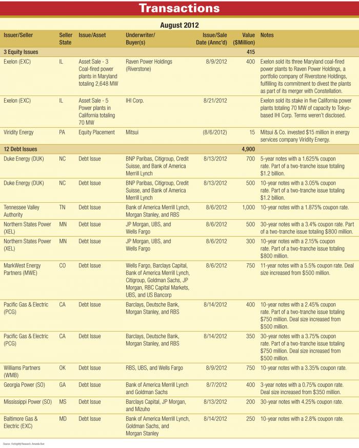 Fortnightly Magazine - October 2012 Exelon sells plants in Maryland and Cali; Mitsui buys into Viridity; Duke issues $1.2B; plus deals at TVA, Xcel, PG&E, etc. totaling $4.9B. Tags: ExelonViridityDukeTennessee Valley AuthorityTVANorthern States PowerXcelXELMarkWest Energy PartnersMWEPacific Gas & ElectricPCGWilliams PartnersWMBGeorgia PowerSOMississippi PowerBaltimore Gas & ElectricEXCRaven Power HoldingsRiverstoneIHI Corp.MitsuiBNP ParibasCitigroupCredit SuisseBank of AmericaMerrill LynchMorgan StanleyRBSJP MorganUBSWells FargoBarclays CapitalGoldman SachsRBC Capital MarketsUS BancorpDeutsche BankConstellationMitsui & Co.