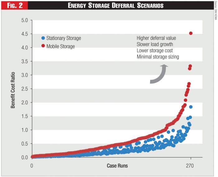 Figure 2 illustrates multiple scenarios with various assumptions regarding storage cost, size, technologies, and expected benefits of the deferral. The chart is a scatter plot of all the simulations that were run for a substation-deferral use case, and it shows how changes in location can affect asset value. The first blue line shows the unit installed and used in a stationary position, and the representative benefit-to-cost ratios associated with all the runs. The red line shows the additional benefits that can be extracted when the unit is moved to multiple locations, optimizing the use of the asset and increasing the number of positive benefit-to-cost scenarios.