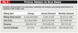Utility load research data can be used to estimate the size of that subsidy by constructing test demand rates for this class of customers, test demand rates that recover the same revenue requirement as the current commodity rates recover. Applying these alternative test demand rates to billing determinants for rooftop solar residential customers is expected to produced increased revenue from such groups of customers by a range of 7% to 17% depending upon the choice of billing demands, monthly versus annual. The individual impacts will depend on customer load factors and the energy production factors of the rooftop solar units.