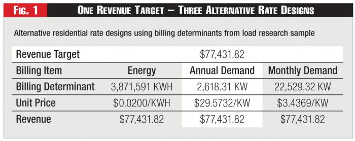 Figure 1 presents three rate designs for collecting revenue from a group of residential customers. The data are from a utility's actual load research sample of almost 274 residential customers. The revenue target was set at $0.02/KWH for the energy taken by these customers. The annual demand is the sum over this group of customers of each customer's maximum hourly demand during the year. The monthly demand is the sum over this group of customers of the sum over the year of the customer's monthly maximum hourly demand each month.