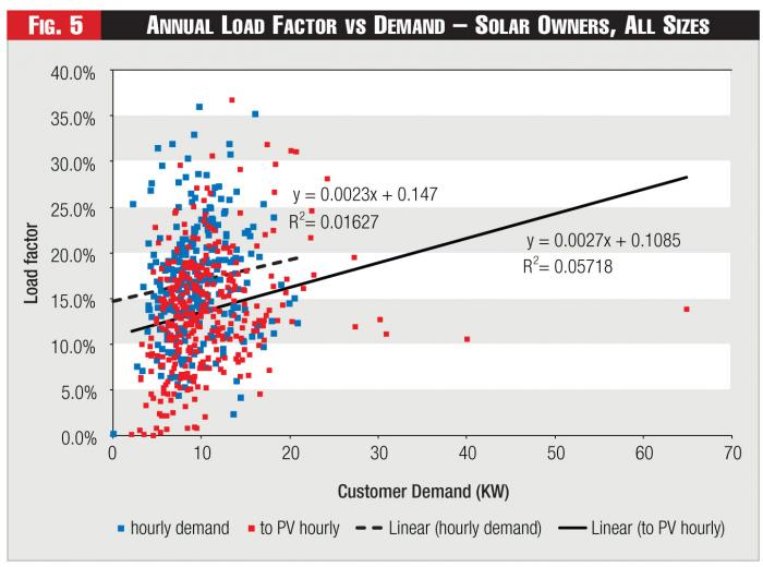 Figure 4 adds data from rooftop solar customers. The added regression line (solid black line) indicates that the load factor for this group of customers is also almost random relative to the size of the residential customer with rooftop solar. The more significant feature of the regression line is that the rooftop solar customers have a lower load factor than do the customers in the load research sample, a zero intercept at 10.85% versus 14.70%. The 3.85% differential slowly closes as the size of the residential customer gets larger, but again, the degree of closure is not significant.