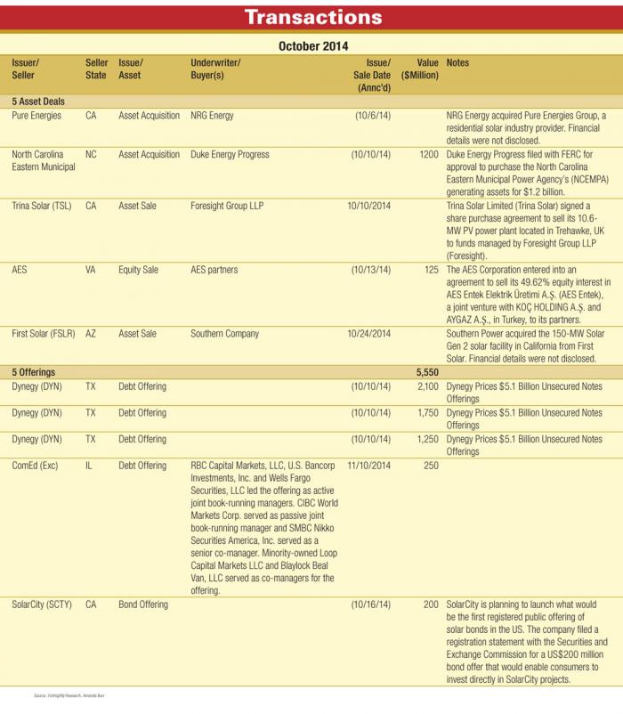 NRG Energy acquired Pure Energies Group, a residential solar industry provider; Duke Energy Progress filed with FERC for approval to purchase the North Carolina Eastern Municipal Power Agency’s generating assets for $1.2 billion; Trina Solar Limited signed a share purchase agreement to sell a power plant to funds managed by Foresight Group LLP; AES entered into an agreement to sell its 49.62% equity interest in a joint venture in Turkey; Southern Power acquired the 150-MW Solar Gen 2 solar facility in California from First Solar; SolarCity is planning to launch what would be the first registered public offering of solar bonds in the US; and debt offerings from Dynegy and ComEd.