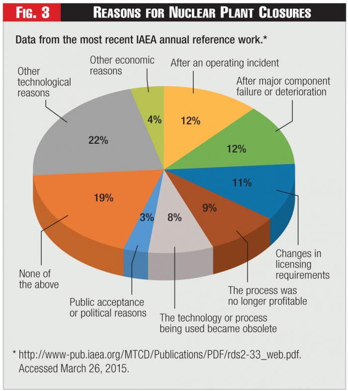 Of the 150 nuclear reactors that have been decommissioned, the vast majority have simply reached the end of their economic or technological lifespan. The most recent IAEA annual reference on nuclear power gives the following reasons why reactors have closed in the past:4