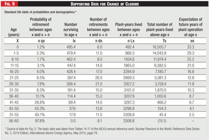Turning to Figure 5, showing a Standard Life Table from demographic analysis for the word's nuclear reactors. Interpretation of the table is roughly the same as similar tables in demographics, i.e., the chance of mortality increases gradually with age. The cumulative survival rate is the product of survival rates for the current cohort and earlier cohorts. Thus for the 36-40 year cohort, approximately 40% of all reactors have closed. (Ed. Determined roughly by adding all of the entries in Figure 5 in the column labeled "Probability of Retirement between ages x and x+n", for all cohorts beginning with 0 years and ending with 36-40.) The pessimistic survival rate in the 46-50 cohort reflects the fact that no nuclear plants have stayed in operation for 50 years. Obviously, this cohort represents a very small sample, so an estimated value has been used for the 46-50, 51-55, and 56-60 cohorts.