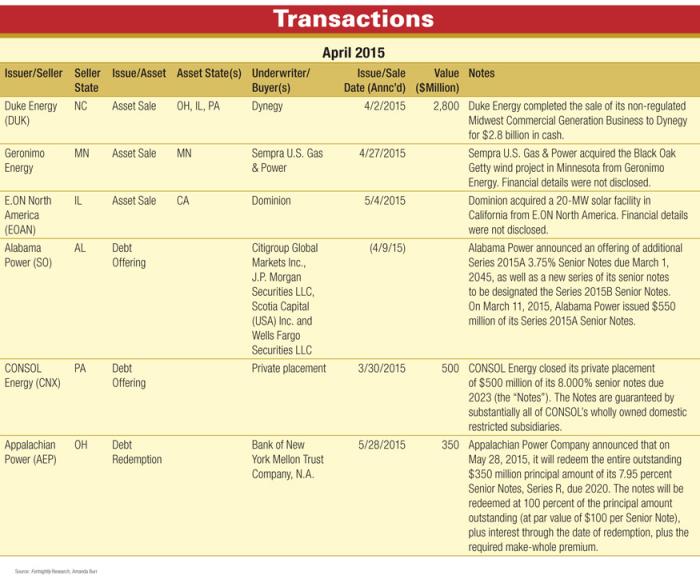 Duke Energy completed the sale of its non-regulated Midwest Commercial Generation Business to Dynegy for $2.8 billion; Sempra U.S. Gas & Power acquired the Black Oak Getty wind project in Minnesota from Geronimo Energy; Dominion acquired a 20-MW solar facility in California from E.ON North America; Plus debt offerings from Alabama Power, CONSOL Energy and Appalachian Power.