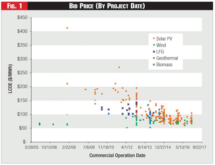 Overall, as competition between project developers has increased, we find that bidding strategies have changed substantially. Until recently, many developers employed a bottom-up, pro forma approach, adding up costs to arrive at a reasonable bid offer. But today, because of intense market competition, many developers use a top-down, bid-to-win to strategy. And this strategy, whereby developers bid a price calculated to win the RFP (and as coupled with consolidation among development firms), has helped to decrease bid prices.