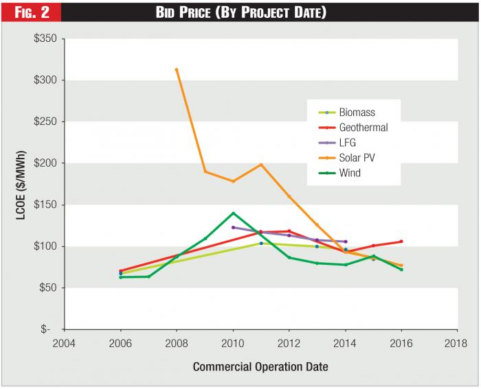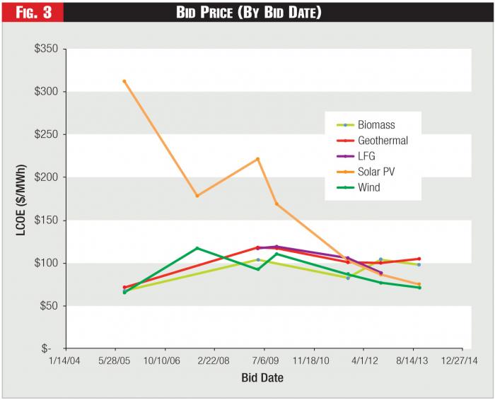 We have considered five different categories of renewable energy projects: 1) wind, 2) solar photovoltaic (PV), 3) landfill gas (LFG), 4) geothermal, and 5) biomass. And upon studying the RFP bid data made available by Palo Alto, across the five technologies, we find that bid prices - which in 2005 were seen to span a range from $50 to $200/MWh - had converged by 2013 to a range of between $60 and $100/MWh.