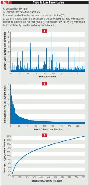 As shown in Figure 1 (A), the flow rate of leaks can vary significantly. When ranked from largest to smallest as shown in Figure 1 (B), the relative importance of different leaks is transparent and the relative contribution of each leak to overall leak flow rate is easily quantified in Figure 1 (C).