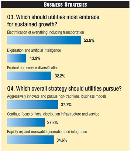 While grid modernization initiatives remain a high priority for most utilities and a critical evolutionary step to improve grid resiliency, survey respondents were less likely to suggest digitization and artificial intelligence, 14 percent, to support sustained growth. Less surprisingly, utilities will strategically focus on electrification, 54 percent, and product and service diversification, 32 percent, pursuing new revenue opportunities to offset continued decline in overall demand.