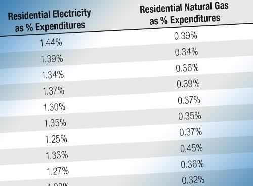 Residential natural gas service took up 0.32 percent of consumer expenditures. Since residential electric service is essentially universal in the U.S., and natural gas service is not, for space heating particularly, that the gas service percentage is one-quarter the electric service percentage only means that the gas service percentage makes more sense in the energy affordability conversation when the two percentages are aggregated.