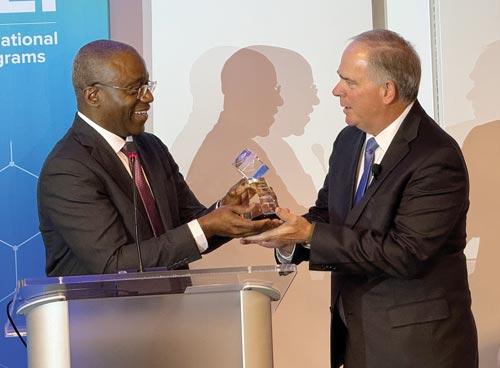 Lead image: Presenting EEI’s TENTIL award, from left, EEI’s Lawrence Jones, and the awardee, Nick Akins, retired CEO, American Electric Power.