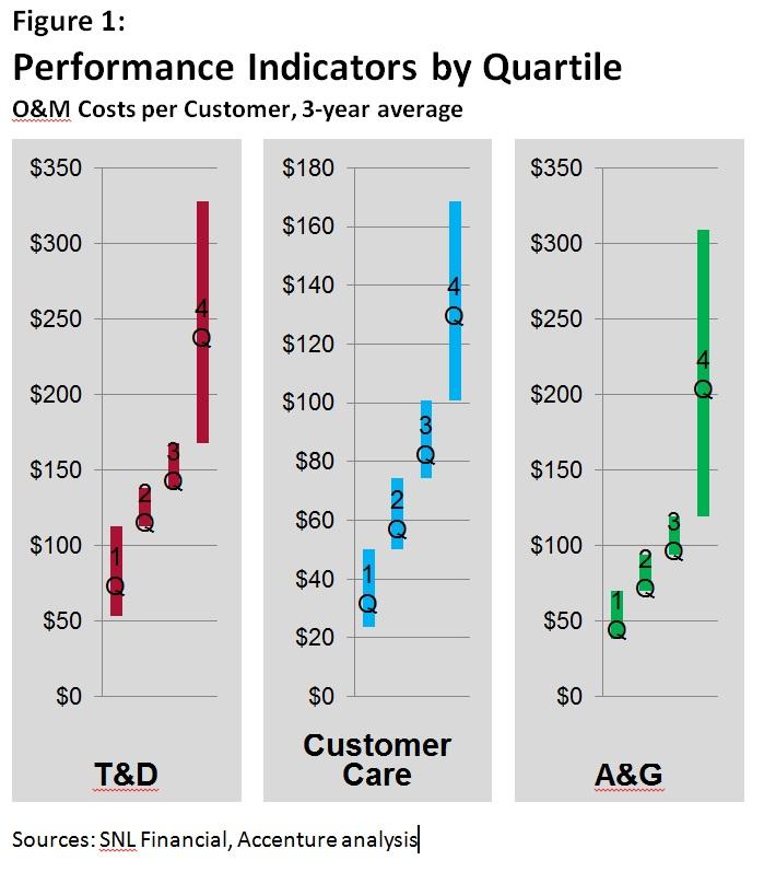 Variations in operational performance across the utility industry indicate significant improvement potential—what we identify as “untapped value.” For instance, some companies are spending three or four times as much as others per customer for critical functions such as customer care. While elements of this discrepancy can be explained by regional differences, regulatory requirements, and similar factors, the majority of the performance gap is due to inefficiencies in the industry and to regulatory constructs which do not incentivize utilities to drive operational and cost improvements. Industry-wide, there is approximately $4 billion annual operations and maintenance (O&M) untapped value, which is roughly 10 percent of the annual O&M spending for the industry. As we can see in Figure 1, there is significant variance of performance in each of the three major O&M categories—transmission and distribution O&M per customer, customer care O&M per customer, and administration and general O&M per customer. In all cases, there is a long tail of performance in the fourth quartile.