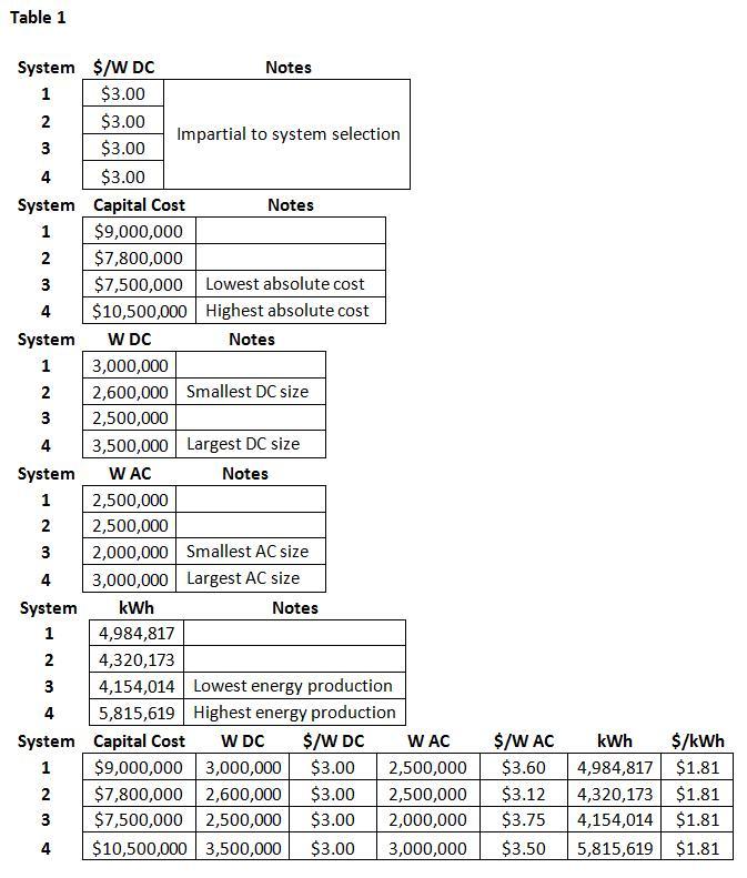 largest $/W AC; System 2 has the lowest $/W AC but a relatively low energy output; System 4 has the highest energy output, but the highest capital cost; and System 1 is never the highest or lowest in any category.