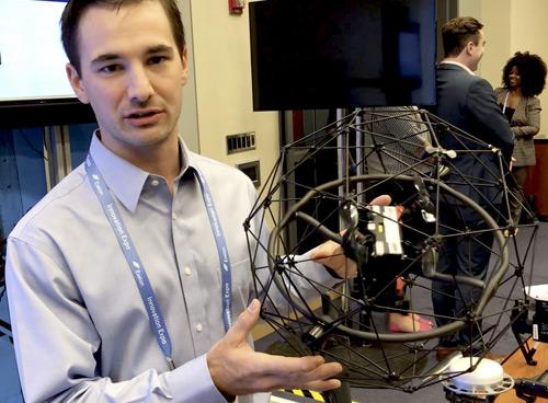 You can step over here, so you can see. What makes this drone unique is that it is covered in a cage that makes it collision-tolerant. So it can bump into walls. It can roll on the floor. Its main use is for flying in confined spaces or areas that are inaccessible.