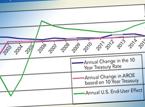 Interest rates drive retail T&D rates in a variety of different ways, from cost-of-debt to option valuation for hedging purposes. One of the more direct effects, and the one that will be examined, is the interest rate captured in the allowed return on equity (AROE) for transmission and distribution prices. T&D prices in most jurisdictions currently are determined by cost-of-service (COS) ratemaking and are expected to remain so into the future. The COS method dictates that a utility can recover all its costs plus a reasonable rate of return on invested capital.