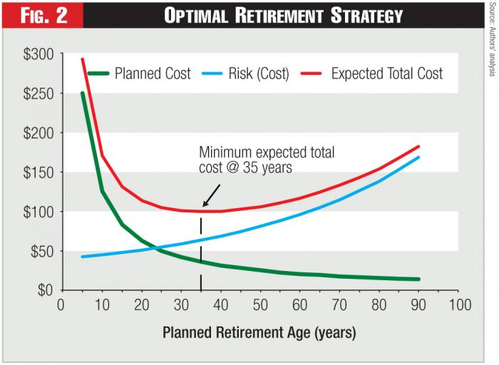 The optimal retirement age is defined as the one for which the expected total cost is minimized. This is shown in Figure 2. The expected total cost is the sum of the planned replacement costs and the expected cost of asset failures (risk). In the example presented in Figure 2, the minimum expected cost occurs at a planned retirement age of 35 years for this type of asset.2