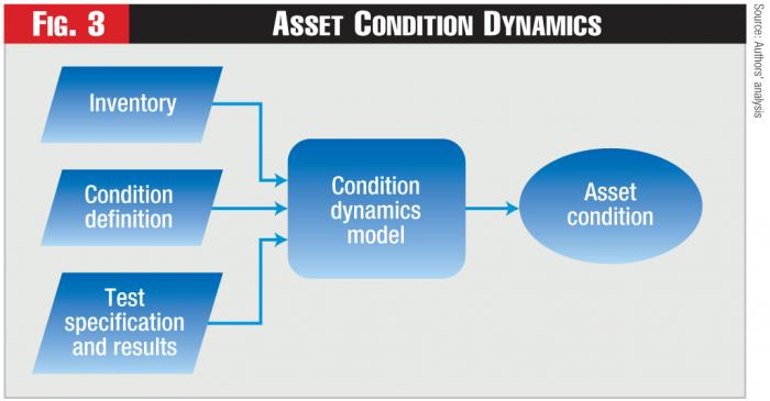 As we discussed previously, determining an optimal asset management strategy requires that we determine how an asset’s condition changes over time, because the condition of an asset at any time t determines the probability of failure thereafter. To do this, we combine condition definitions (e.g., what does it mean for an asset to be in good condition today?) with tests that can evaluate the asset’s condition. These are combined to establish what we call a “condition dynamics model (CDM).” The CDM determines how an asset’s condition is likely to change over time, given its current condition.7 (See Figure 3).