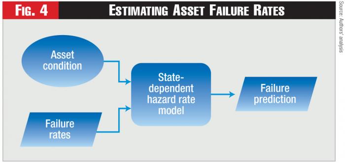 However, knowing an asset’s condition today – unless it’s already failed – and the forecast of asset condition given by the CDM won’t provide enough information to make asset management (repair, replace, test, do nothing) decisions. That requires a model that estimates the likelihood of asset failure tomorrow, given an asset’s condition today. Such models are called State-Dependent Hazard Rate Models, as shown in Figure 4.
