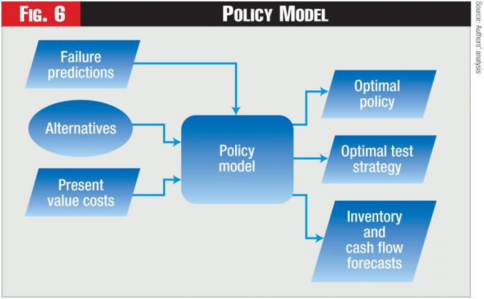 Developing an optimal policy for each class of assets requires additional information, including: 1) the available types of repairs (e.g., major? minor?); 2) the type of replacement asset (e.g., the same asset type? an improved asset?); 3) the costs of the different alternatives; and 4) the probability distribution of the cost of failure. Moreover, the optimal policy includes determining the optimal testing policy, based on the accuracy and the cost of alternative testing regimes. Thus, the Policy Model, shown in Figure 6, can determine the optimal policy as well as the expected benefit of alternative testing regimes. The Policy Model also forecasts the behavior of the asset inventory and the cash flows associated with implementing the optimal policy.