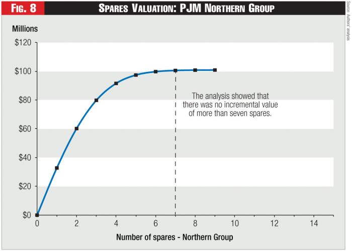 The expected value of a spare at a given location within the RTO is based on several factors. Not surprisingly, the first factor is the expected value of reduced outage duration. Thus, if the cost of a forced outage at location X is $OX per hour, then the expected value of the spare, E(VS,X), equals the probability of failure, PX(f), times the expected reduction in outage time because of locating the spare at X, ∆TX, times the outage value, i.e., E(VS,X) = Px (f)•∆TX•$0X.
