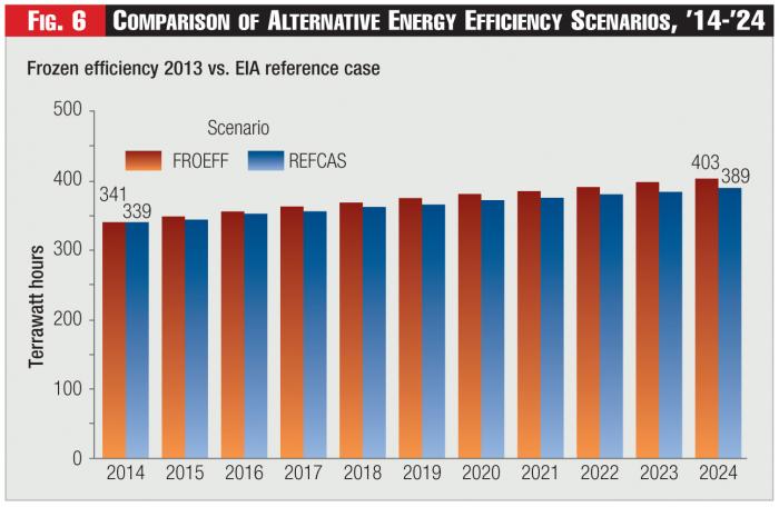 Figure 6 displays a comparison between the Frozen Efficiency scenario and the EIA Reference Case. As previously mentioned, the EIA Reference Case culminates in a 2024 ERCOT load of 389 TWh - significantly lower (i.e., greater efficiency and less intensity) that the Frozen Efficiency 2024 load of 403 TWh but significantly higher (less efficiency, more intensity) than the Current Trends scenario.