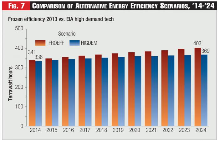 Figure 7 displays a comparison between the Frozen Efficiency scenario and the EIA High Demand Technology scenario - which yields a 2024 load of 369 TWh. As expected, this scenario is significantly below (more efficient, less intensive) both the Frozen Efficiency scenario and the EIA Reference Case.