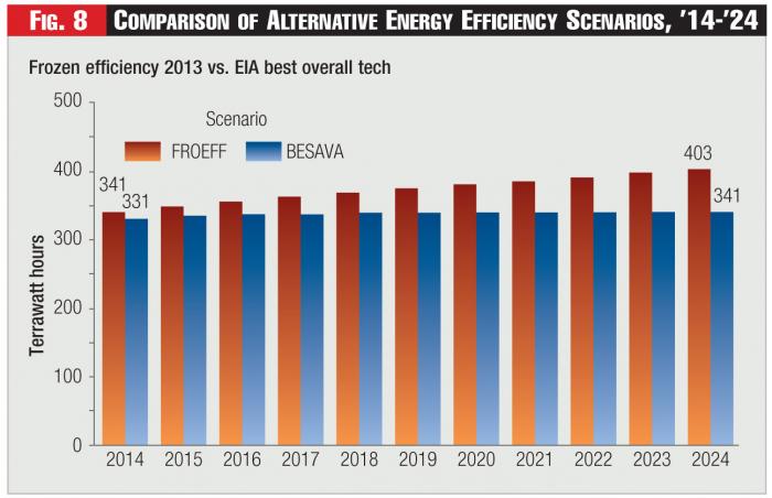 Figure 8 displays a comparison between the Frozen Efficiency scenario and the EIA Best Available Technology scenario - which yields a 2024 ERCOT system load of 341 TWh.