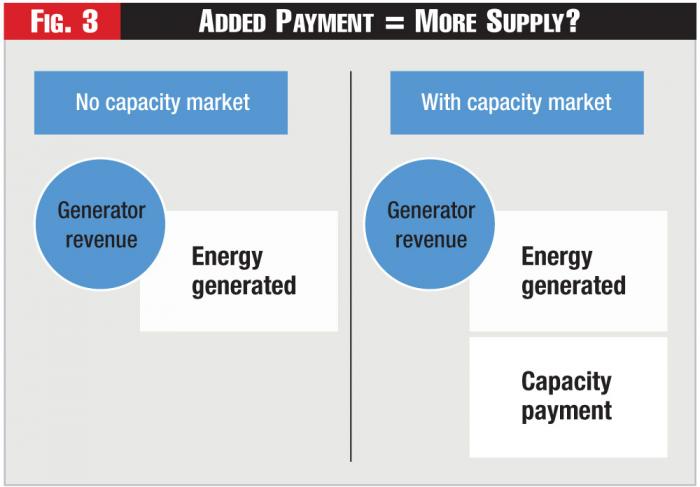 In a capacity market, the generator owner will get paid for having capacity regardless whether the unit was needed that year - assuring some revenue for the generator owner. An outside power analogy would be a line item on everyone's cell phone bill for Apple to assure they overbuild their production facility in order to meet the demands of the next iPhone. With this additional revenue, the theory would be that Apple would be willing to overbuild/plan their facilities from their typical business plans. The simple margin on selling their goods was not enough to ensure adequate supply. Clearly having the latest iPhone is not on par with having electricity - but perhaps that's why electricity was regulated in the first place.