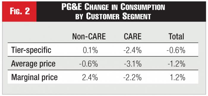 Consumption Impacts. We estimate that PG&E's annual residential consumption will decrease by 0.6 percent using the Tier-Specific methodology and by 1.2 percent using the Average Price methodology. It will increase by 1.2 percent using the Marginal Price methodology. In other words, two of the three methodologies predict a modest increase in conservation attributable to PG&E's proposed rate changes. Due to the proposed reduction in the CARE (i.e., low income) discount, CARE customers are likely to reduce consumption by a larger percentage than Non-CARE customers. Results of the analysis by customer segment and simulation methodology are summarized in Figure 2.