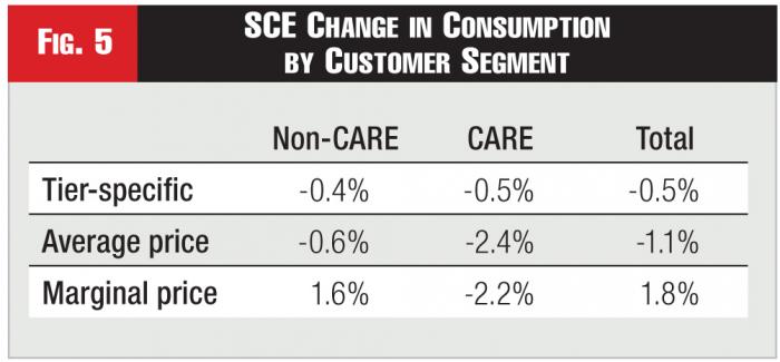 Consumption Impacts. As was the case in the PG&E analysis, two of the three methodologies predict a modest increase in conservation (i.e., a decrease in consumption) attributable to SCE's proposed rate changes. Under SCE's new rate proposal, we estimate that annual residential consumption will decrease by 0.5 percent using the Tier-Specific methodology and by 1.1 percent using the Average Price methodology, and will increase by 1.8 percent using the Marginal Price methodology. Results of the analysis by customer segment and simulation methodology are summarized in Figure 5.
