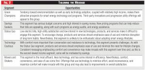 Green Champions, for instance, exhibit the highest interest in pricing options and may be a priority for utilities offering critical peak rebates. Savings Seekers also like pricing options to save money. That example might call for one program to be messaged differently to two different segments. (See Fig. 2 on "Segment Opportunities.") Thus a consumer segmentation approach with segment-appropriate messaging should enable utilities to create tailored messaging for non-tailored programs, meeting two goals: consumers receive a message appropriate to their values and interests, and utilities save marketing dollars by limiting exposure to consumers most interested in their messages.