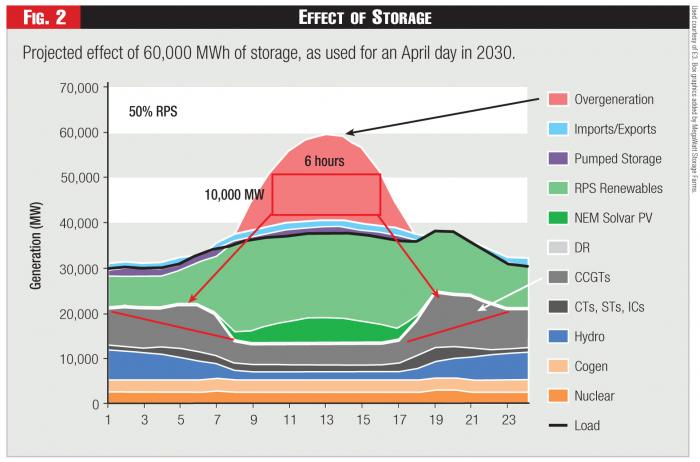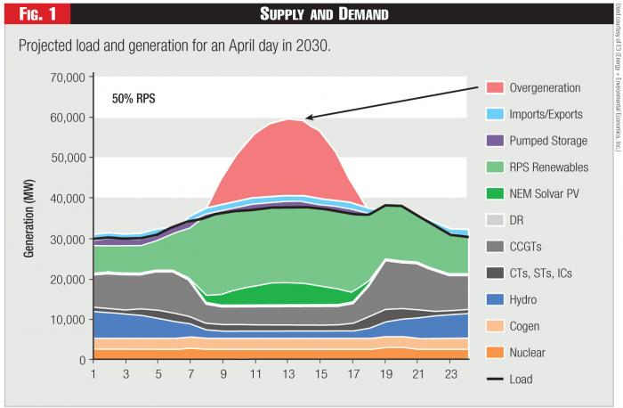 Figure 1 shows the projected California mid-day overgeneration expected in 2030 with 50 per cent renewables.5 Overgeneration is the energy above the black curve indicating load. The solid green area shows the mandated RPS renewables. The hatched green area shows the amount of rooftop solar energy covered by Net Energy Metering (NEM).