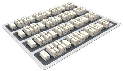 Figure 4 shows the layout of what will be the world's largest battery farm when it is energized in April 2016. This planned installation represents about a 300-MWh (50 MW for six hours) sodium-sulfur based project on about 3 acres. This battery project employs 252 of the 20-foot containers shown in Figure 5, each of which is rated at 1.2 MWh. Note that this density of about 100 MWh and 16 MW per acre compares to solar generation density of 0.14 MW per acre.15 It doesn't take much incremental space at a solar farm to add sodium-sulfur storage for overgeneration and other uses.