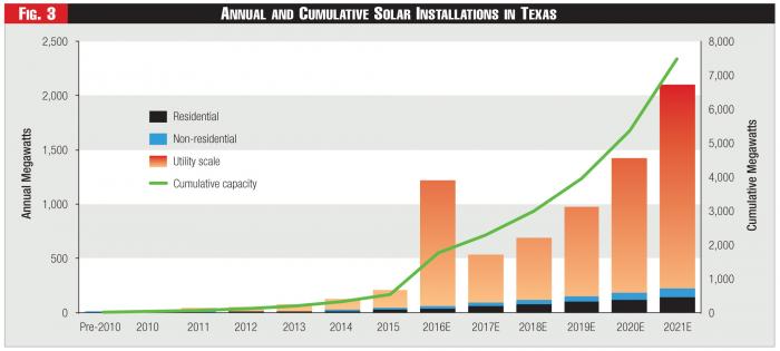 Figure 3 - Annual and Cumulative Solar Installations in Texas