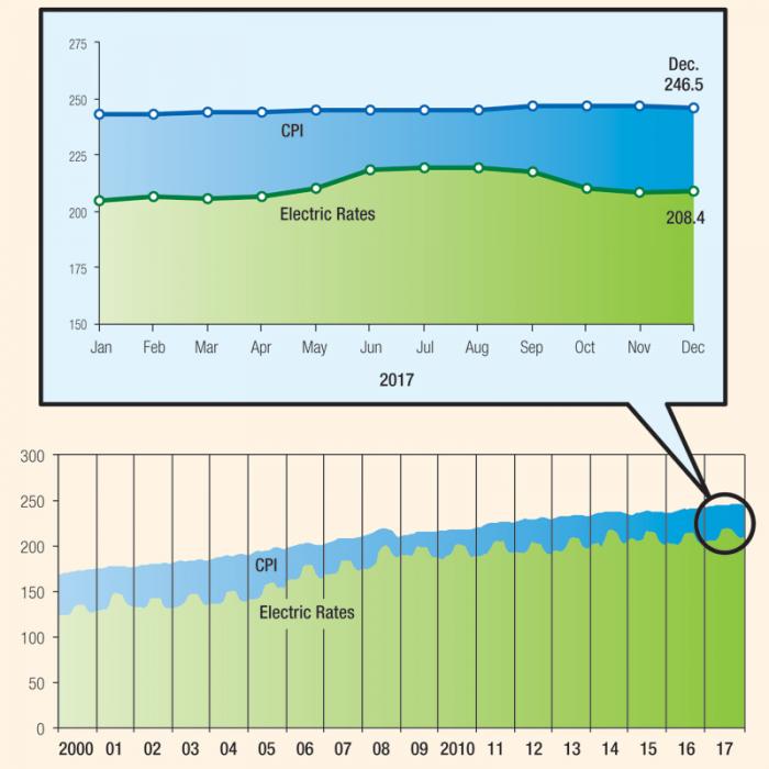 Long-term, electric rates have risen only 84.5 percent as much as the CPI.