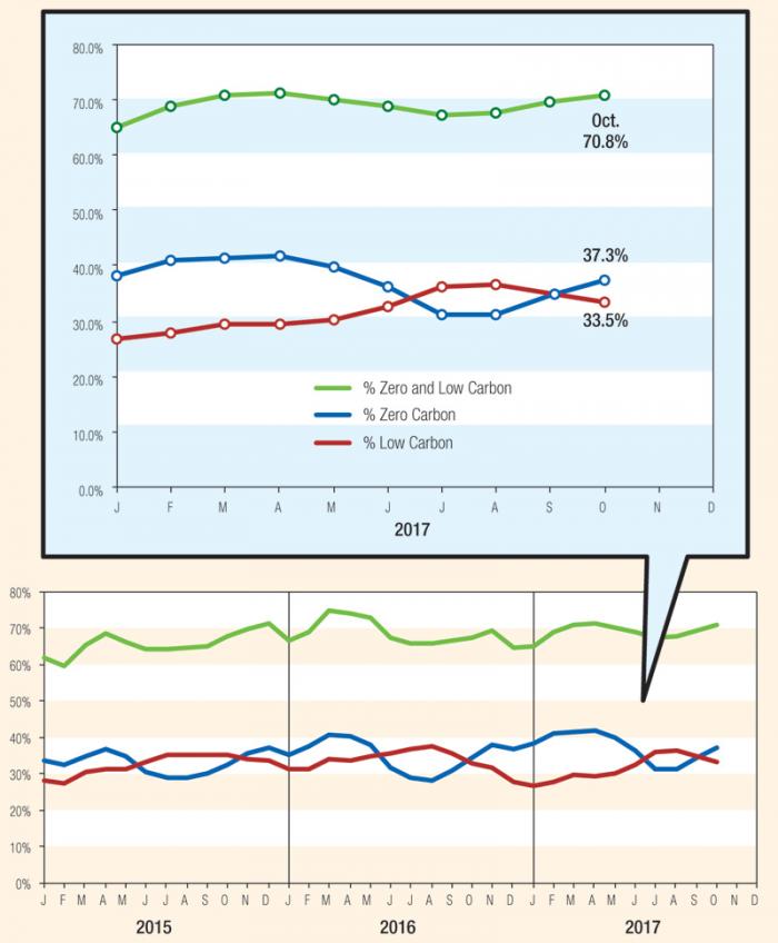 In October 2017, the latest month of data published by the Energy Department, zero carbon generation was 37.3 percent of grid generation and low carbon was another 33.5 percent. Summing the two, 70.8 percent of grid generation was zero and low carbon. This was the seventh highest month historically in terms of clean power production. The record remains March 2016 when 75.1 percent was clean power production.