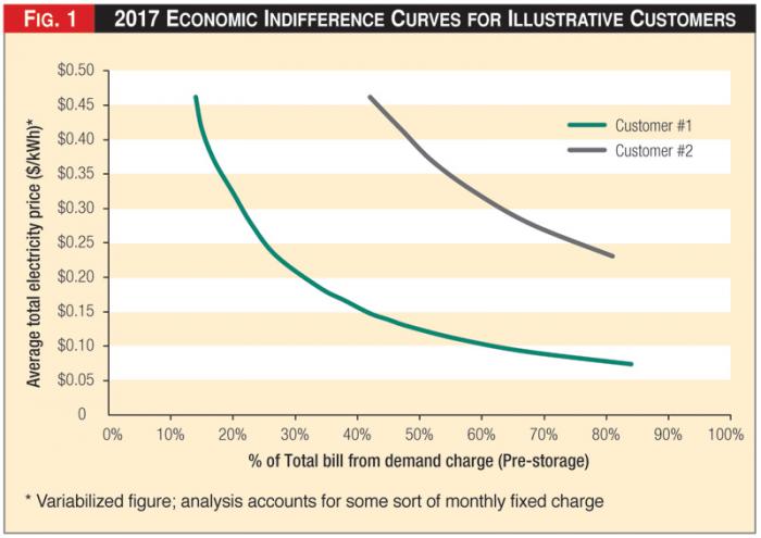 Figure One shows two customers’ economic indifference curves toward behind-the-meter storage. We define economic indifference as the point at which investing in storage makes sense today, based on the average electricity price the customer is exposed to and the percentage of their total bill stemming from a demand charge.