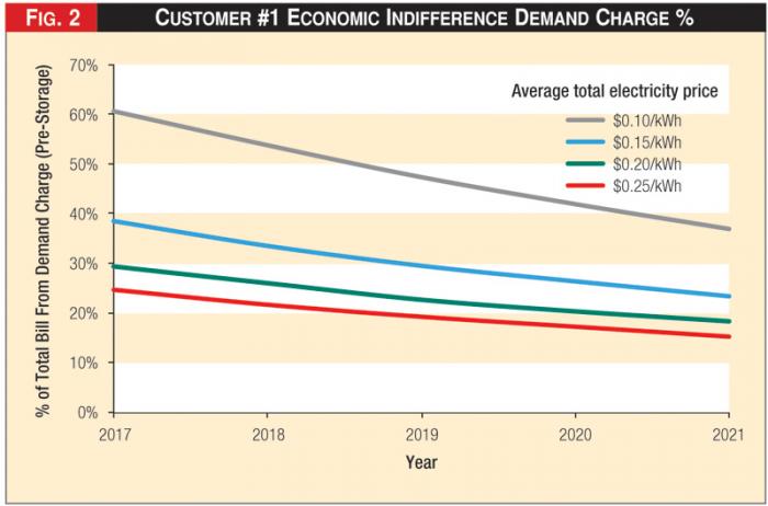 Figure Two shows the case study’s economic indifference curve for Customer #1 over time, based on the expected drop in storage costs. In 2021, if Customer #1’s average total electricity price is at least fifteen cents per kilowatt-hour, we estimate that owning storage will make sense if a demand charge makes up twenty-five percent or more of their bill, as opposed to roughly forty percent in 2017.