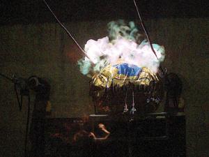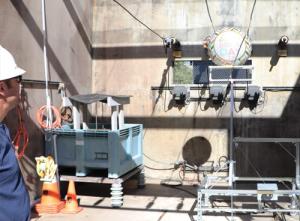 A prototype nonconductive foil balloon is positioned for testing using the most advanced balloon raising test rig at PG&E’s Applied Technology Services facility. The new balloons survived five minutes within conductors at 21 kV phase-to-phase without causing a fault.