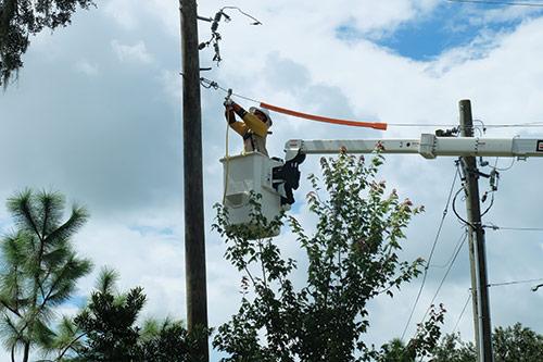 Tampa Electric crews dropping overhead lines.