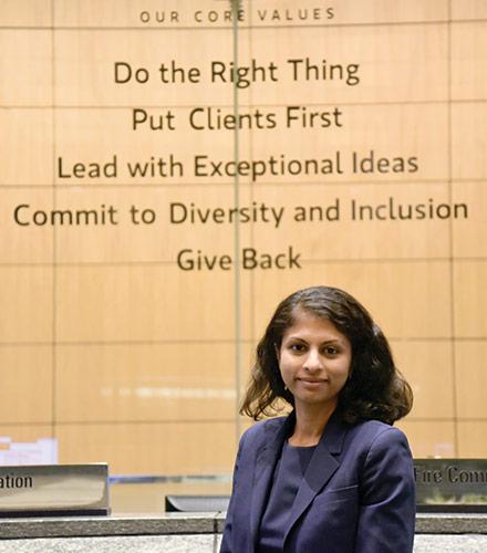 Lavanya Balakrishnan in front of Morgan Stanley’s Core Values, which are displayed in the lobby of every one of Morgan Stanley’s office’s around the world.
