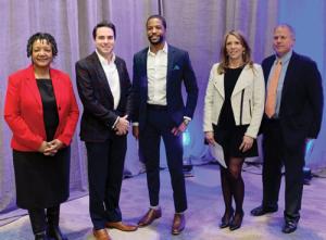 Lead image: Panel on Partnerships Between Telecom and Utilities to Support Grid Modernization and DER Integration, from left, co-moderator, Pennsylvania Chair Gladys Brown Dutrieuille, Anterix’s Andrew Bordine, co-moderator Michigan Commissioner Tremaine Phillips, Crown Castle’s Heather Wilkins and Schneider Electric’s Mark Feasel.