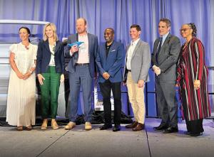 Lead image: At NARUC’s Summer Policy Summit, the NARUC Shark Tank was a highlight, from left, Colorado Commissioner Megan Gilman, NARUC President Julie Fedorchak, Shark Tank winner ConnectDER VP Jonathan Knauer, Virginia Chair Jehmal Hudson, Black Hills Energy VP-Regulatory Nick Wagner, former FERC Chair and Skadden’s James Danly, and Missouri Commissioner Maida Coleman.