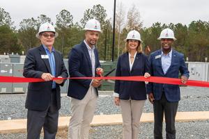 Georgia Power leaders joined elected officials from the Georgia Public Service Commission to mark commercial operation of the Mossy Branch Battery Facility, the company’s first grid-connected battery energy storage system (BESS). From left, Georgia PSC Vice-Chair Tim Echols, Georgia Power SVP Rick Anderson, Georgia Power CEO Kim Greene, Georgia Commissioner Fitz Johnson.